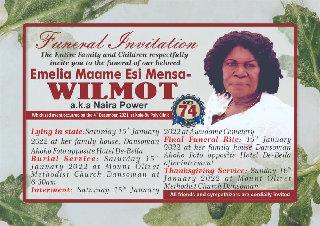 Funeral Arrangements for late Esi Wilmot Announced The final burial rites for the late madam Emelia Maame Esi Mensa-Wilmot have been announced.